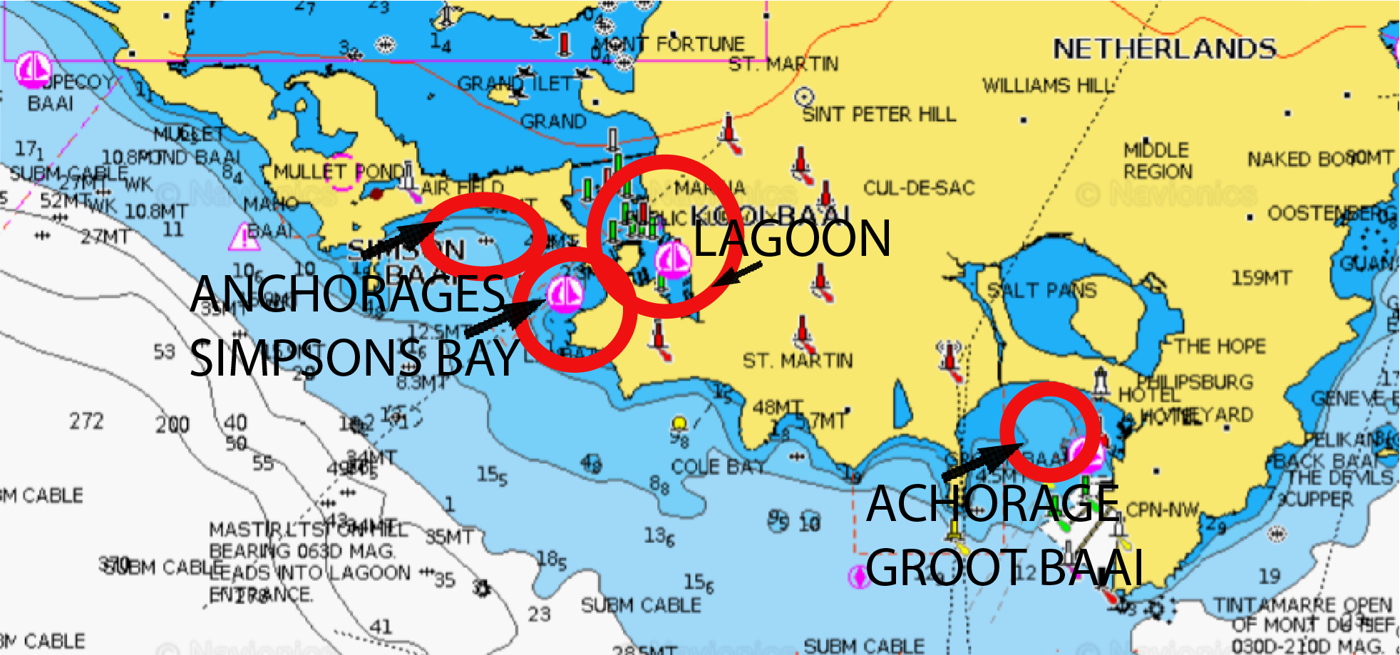 Closest over night stay spot is in the bay of Philipsburg, known as Groot Baai. You can Anchor in the bay just west of the entrance channel, in front of the town. Alternatively, just a 3.5 nm:s away is Simpsons Bay, where anchoring is possible, and popular. From Simpsons Bay you can also access into the Simpsons Lagoon. through the Bridge. Bridge opening hrs you can find HERE. The Lagoon option offers you a choice with more protected anchorage or multiple dockage options in marinas.